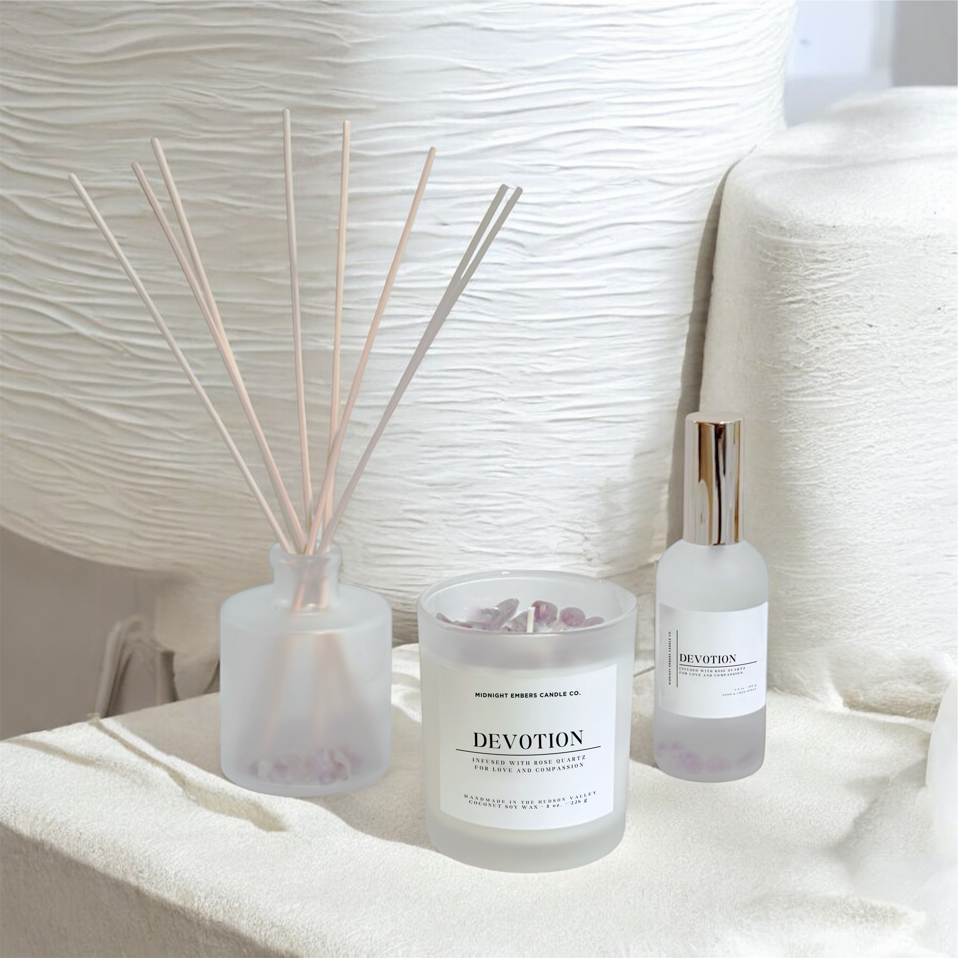 Devotion is a warm, romantic, and grounding candle designed to honor love in all its forms. Infused with rose quartz, the crystal often associated with compassion, emotional healing, and deep connection, this candle invites moments of presence, tenderness, and intentional care.