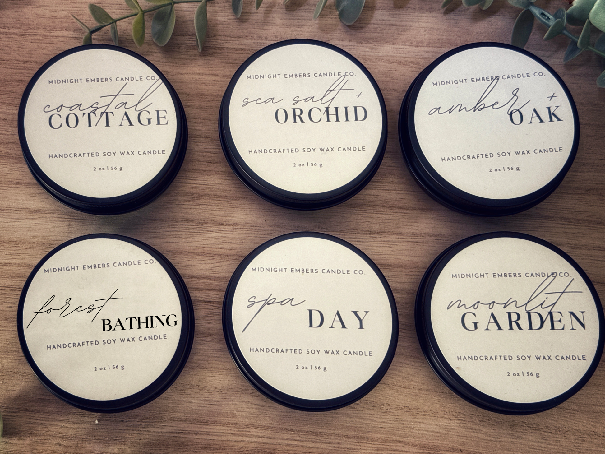 Sample pack of our Spring Collection for you to try them all! 2 oz. mini soy candles with a single cotton wick.