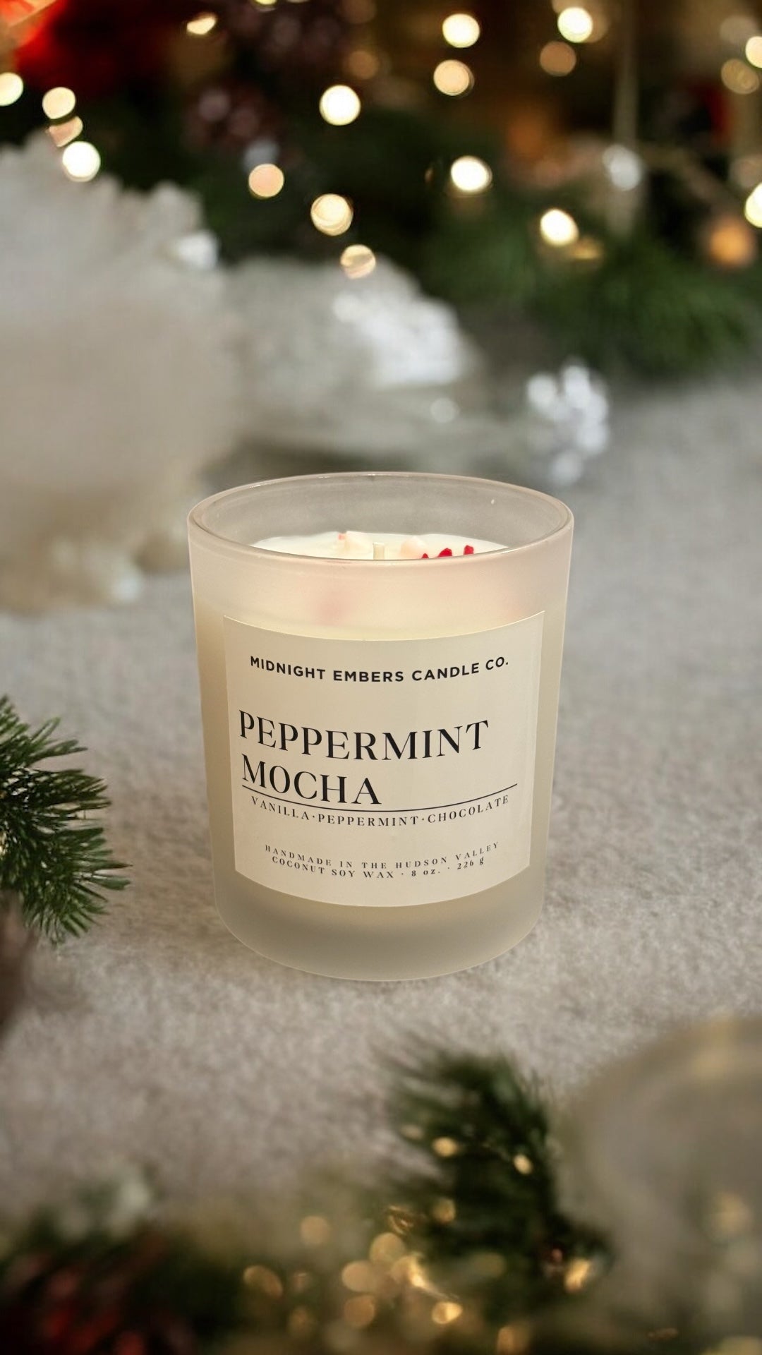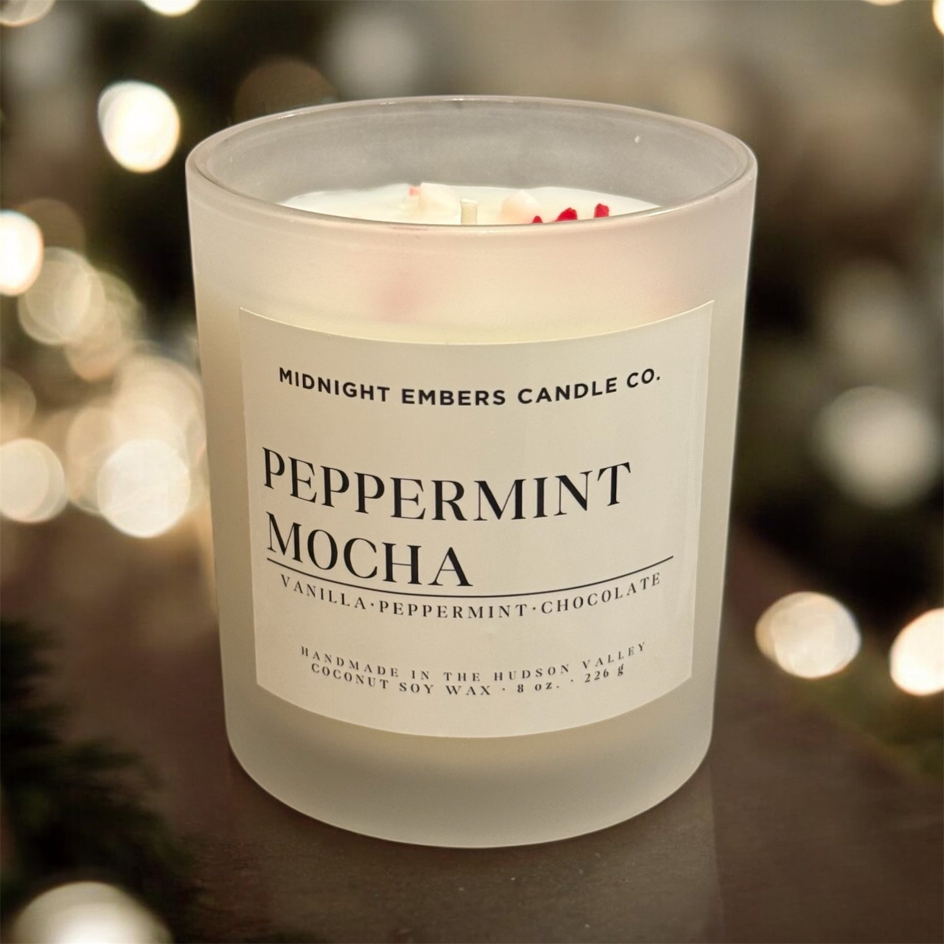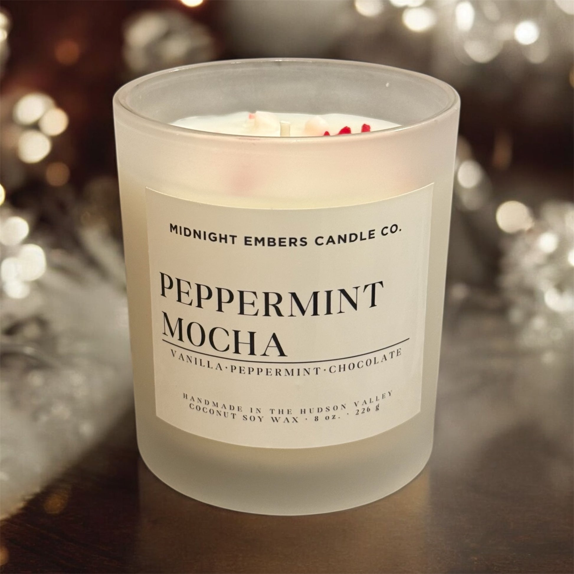 Introducing our limited edition Peppermint Mocha frosted white candle, crafted to bring the magic of a cozy winter café straight into your home. Poured into a sustainable, frosted white reusable glass container, this unique candle combines rich mocha fragrance with invigorating peppermint for the ultimate holiday aroma. Topped with delicate soy "peppermint candy" bits, it looks just like a decadent mocha drink but provides hours of warmth and comfort as it burns. Perfect as a gift or treat for yourself, this holiday-exclusive candle is an inviting blend of seasonal charm and eco-friendly elegance. Light it up and let your space transform into a warm, festive retreat.